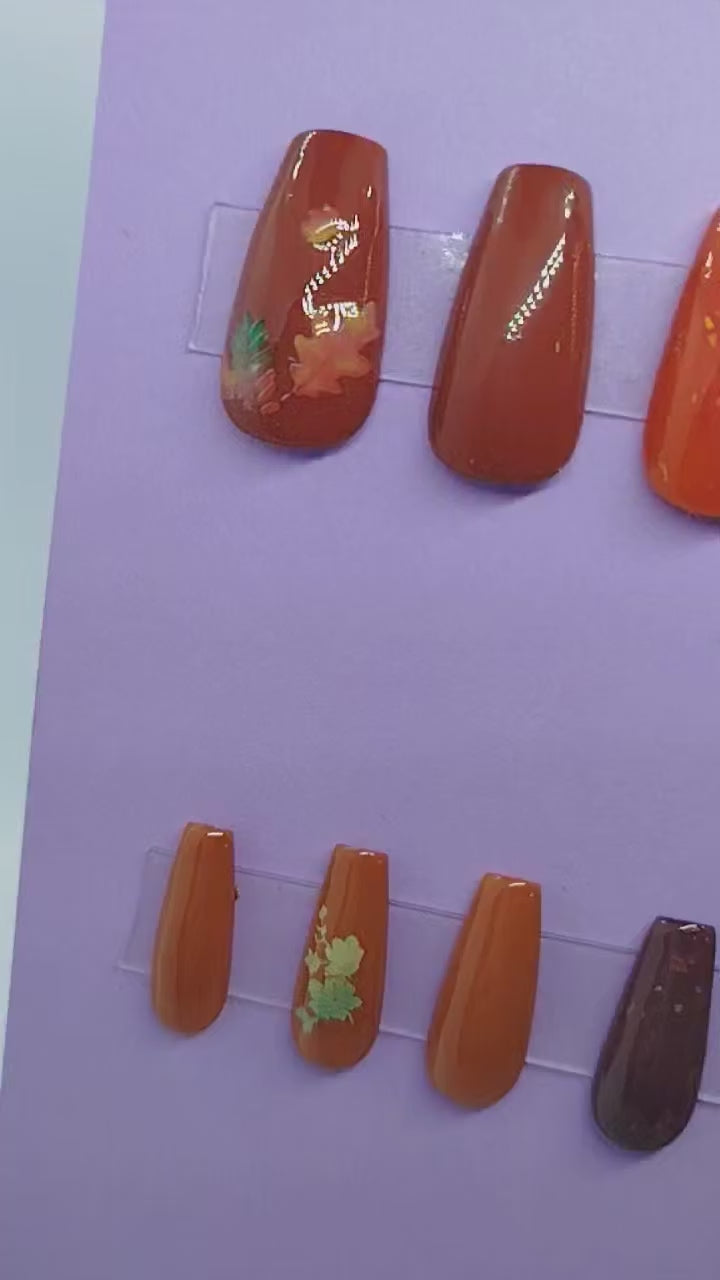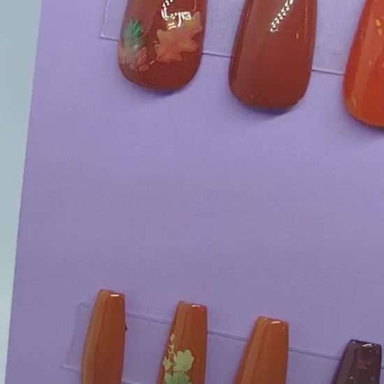 Fall colours with leaves on accent nails and a gorgeous green cat-eye nail