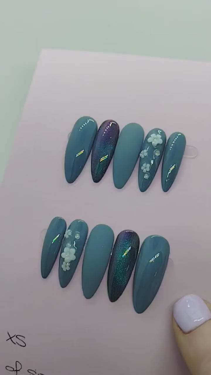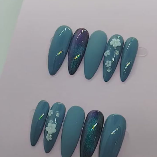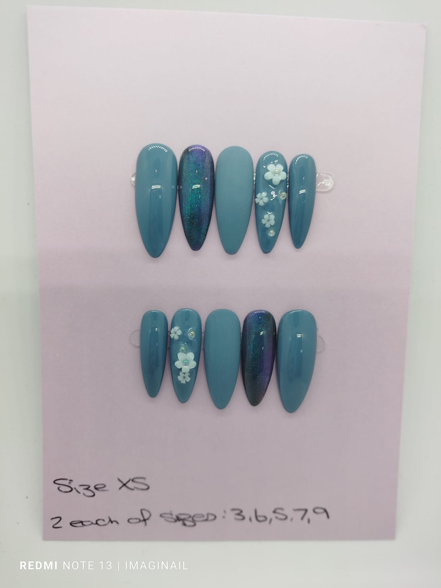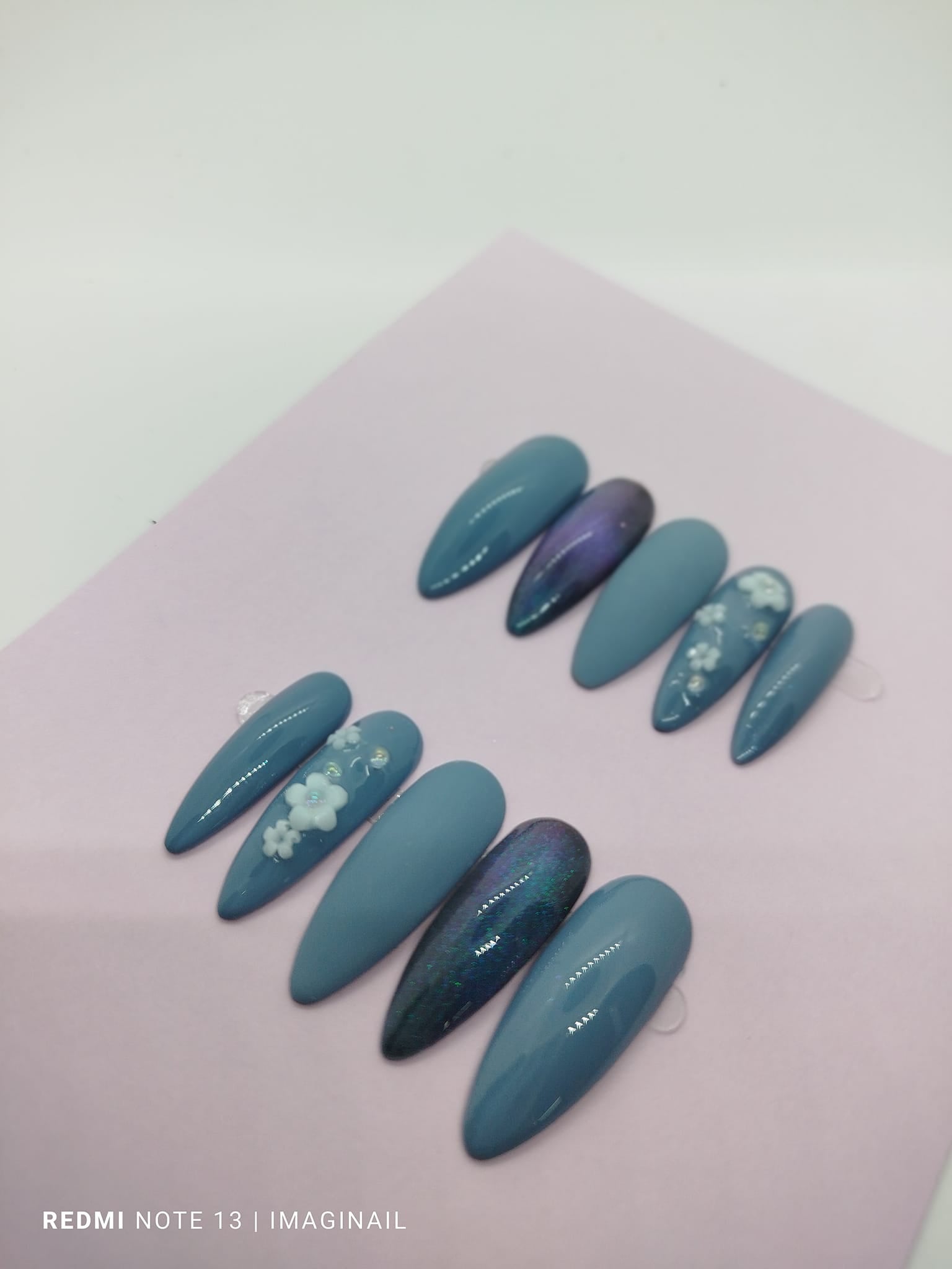 Blue-grey set with one matte nail, one cat-eye nail and one nail with Flower embellishments on each hand.