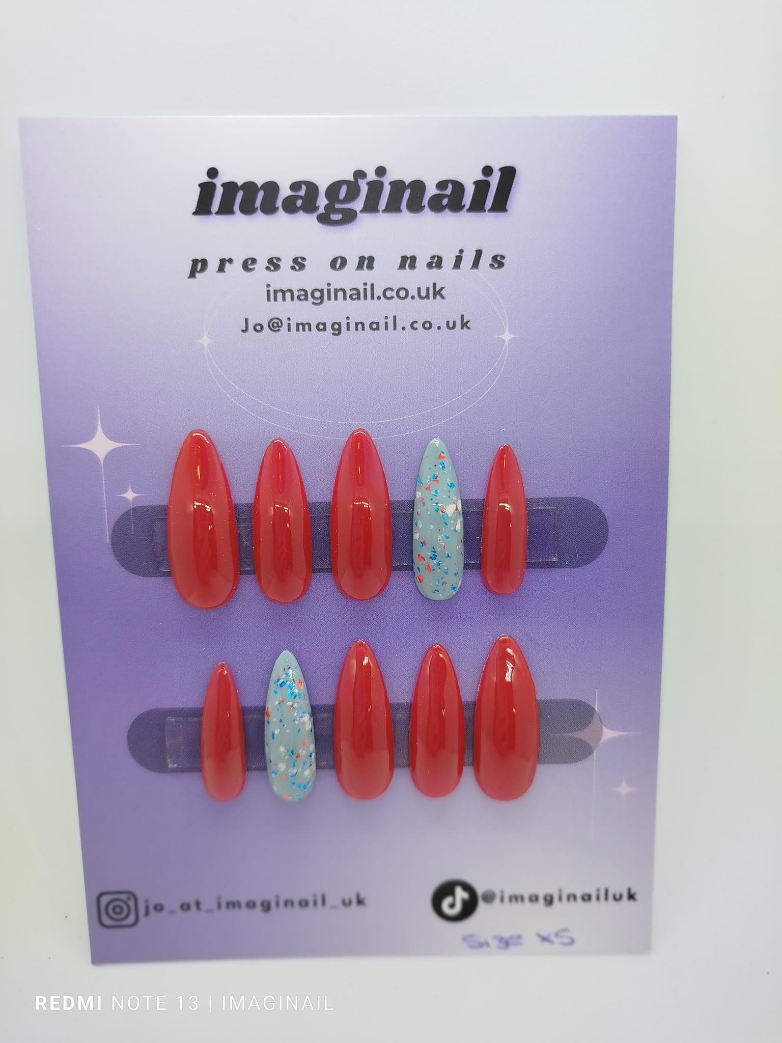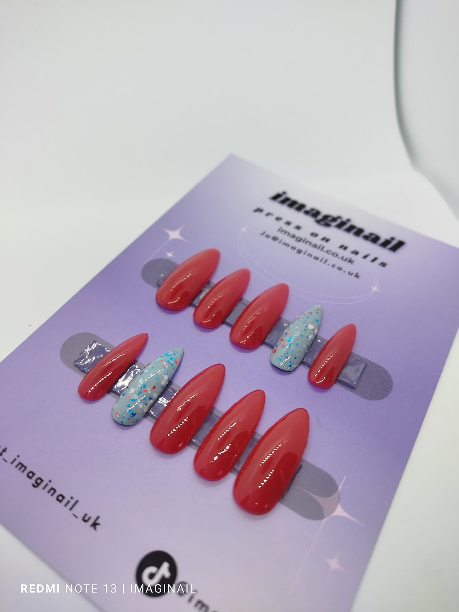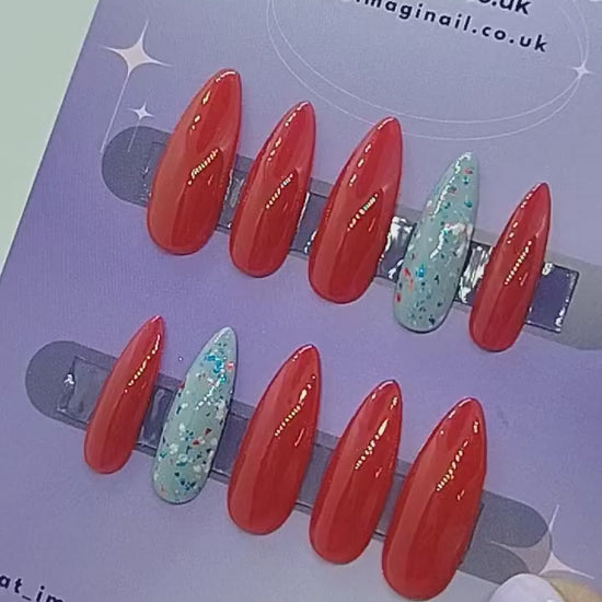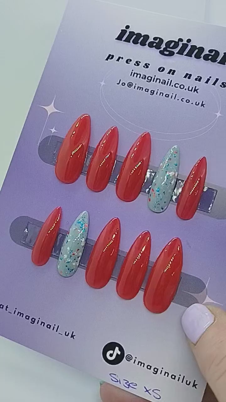 Red nails with a subtle gold shimmer and a Accent nail with red, blue and white confetti.